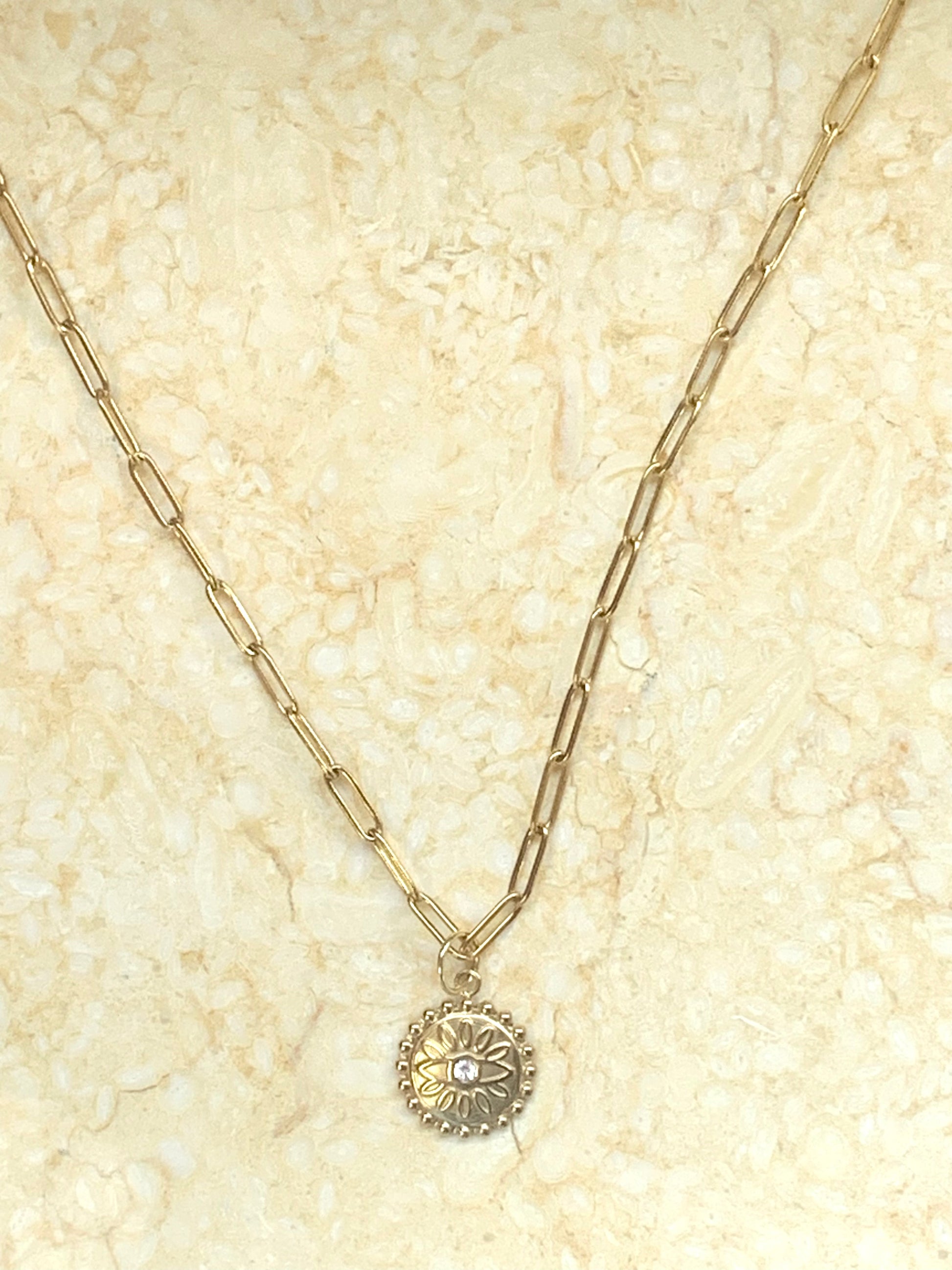 Introducing our Eyebright Necklace, featuring a round medallion with an evil eye symbol and a cubic zirconia on a paperclip chain.