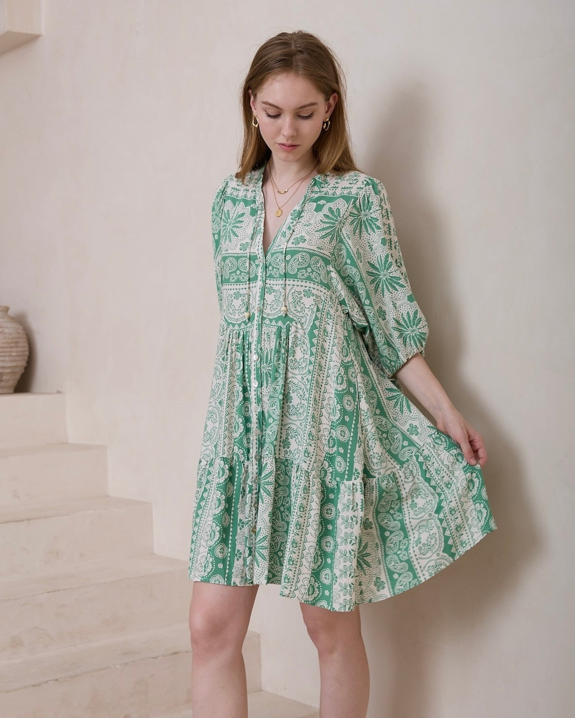 Effortlessly chic, the Gigi Mini Dress in a gorgeous Green and White summer fun palm tree print is sure to be your go-to. The V-neck has ties and bead detail, while the button front and side seam pockets provide both style and convenience. Perfect for any occasion with its versatile knee length and elbow length sleeves with elastic cuff and ties and beads.