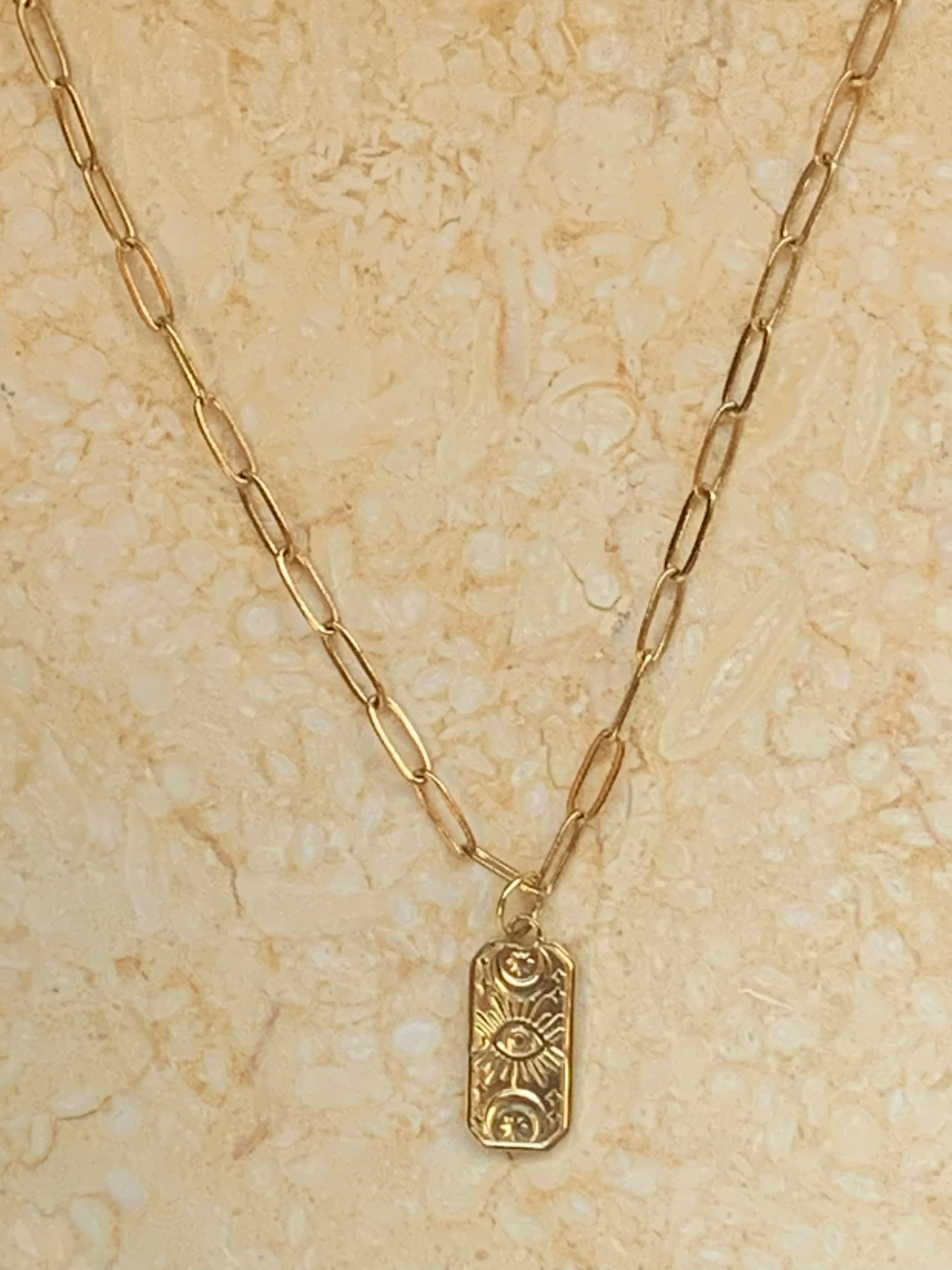 Introducing our Guiding Eye Necklace, featuring a rectangle pendant with an evil eye and moon symbol on a paperclip chain.