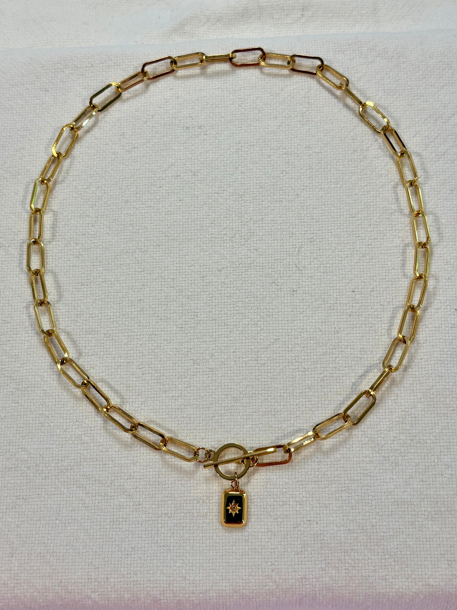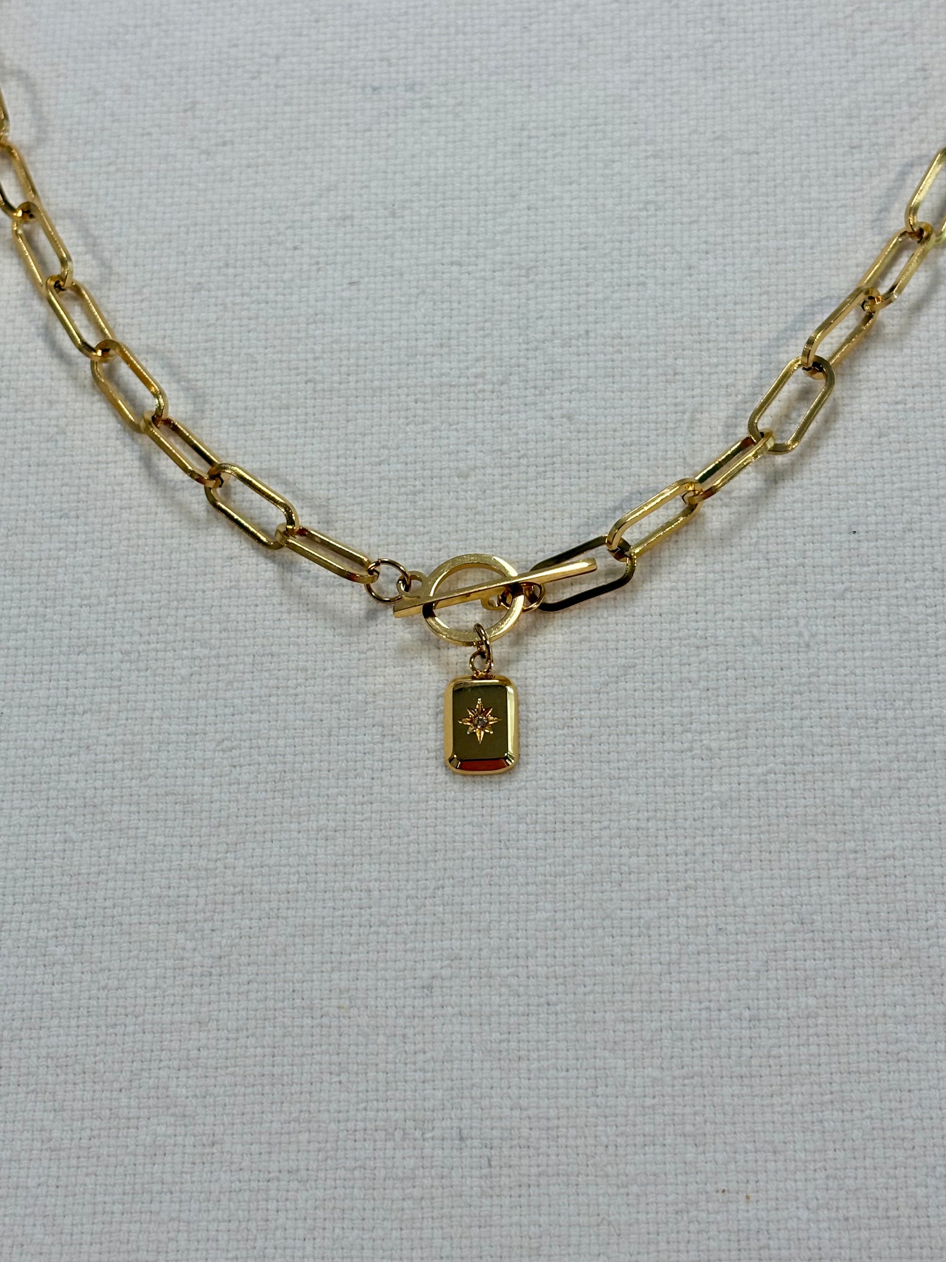 Introducing our Illuminate Necklace, featuring an rectangle pendant with a cubic zirconia center to light the way, this sits on a chunky paperclip chain.