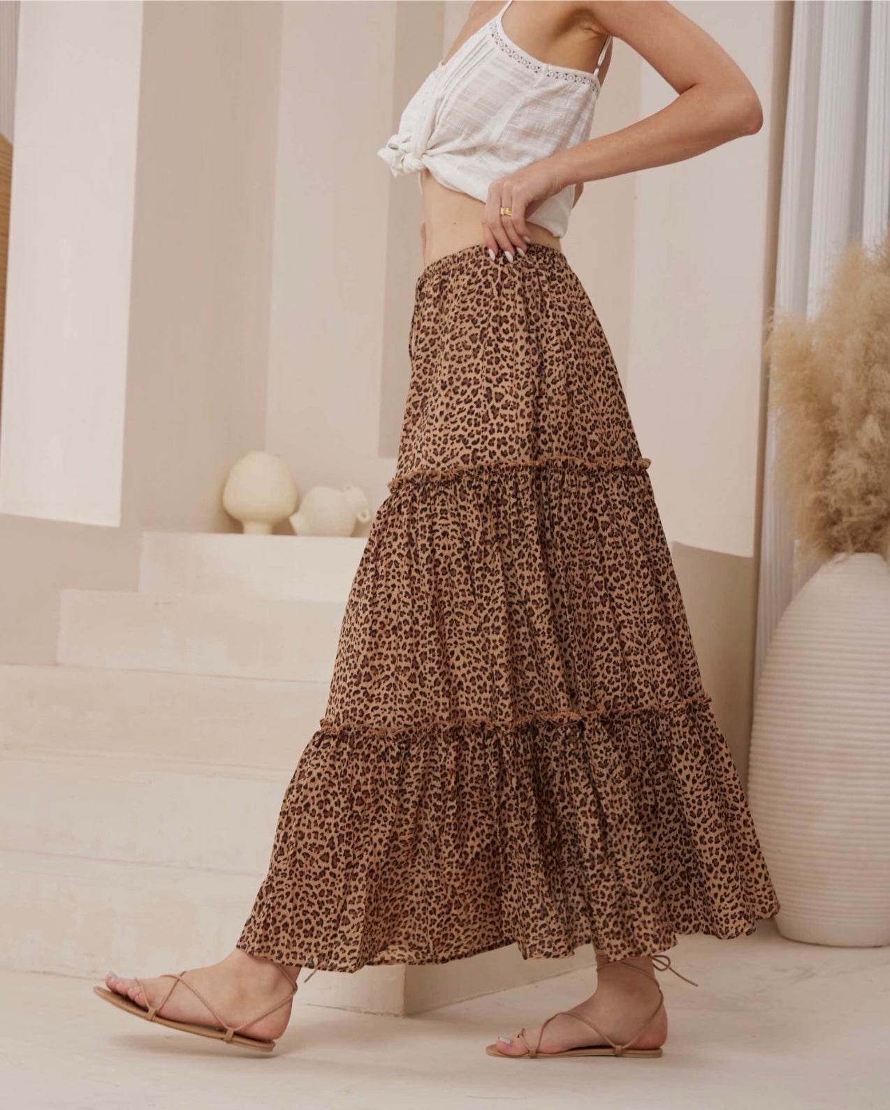 For the lovers of leopard we have the all new Safari Maxi Skirt! This is a classic elastic waist maxi skirt, featuring little frill detail at the tiers. The drawstring at the waist was gold detailing. This natural cotton viscose blend fabric is a dream to wear on hot summer days.