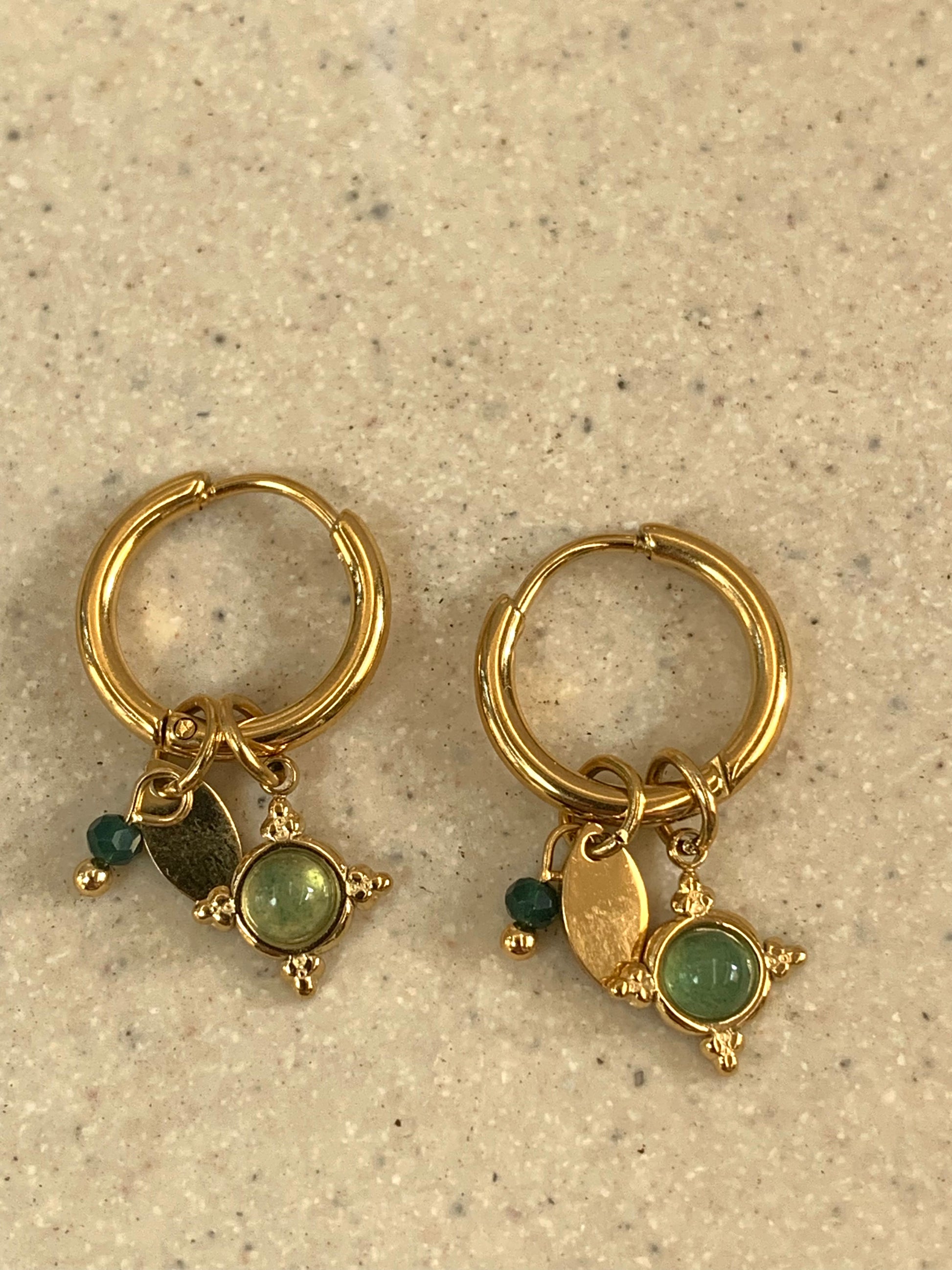 Introducing our Oasis Green Hoop earrings, featuring a green stone drop, and a mini green stone with gold disc drop.