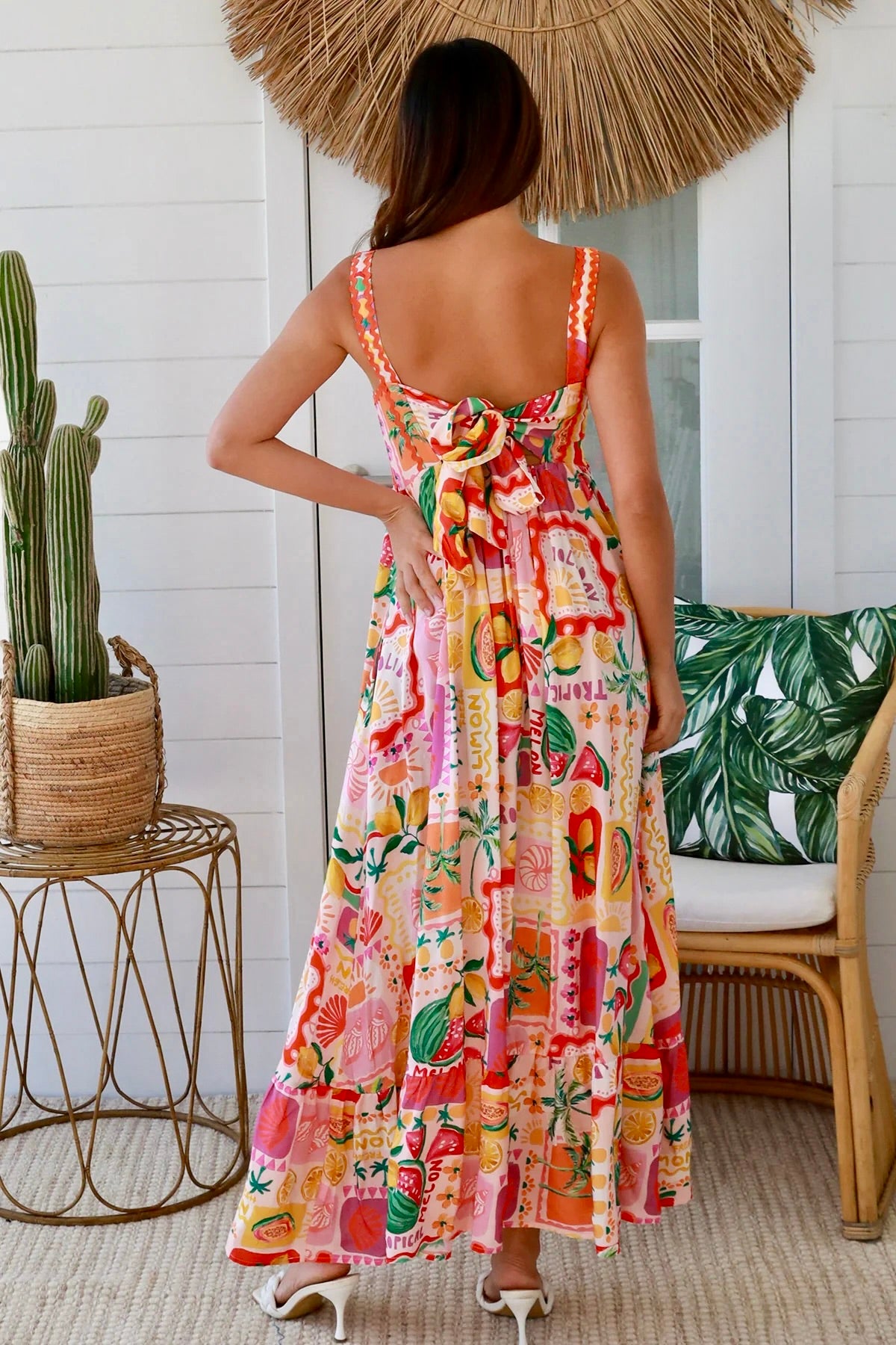 The Ruby Slip Maxi Dress will bring the holiday vibes into your everyday life! She features a fitted bodice with an adjustable tie and elastic at the back for a perfect fit, bra friendly wide straps with ric rac detail and she has pockets. She has a beautiful full tiered skirt and the most amazing print! Perfect for your summer events.