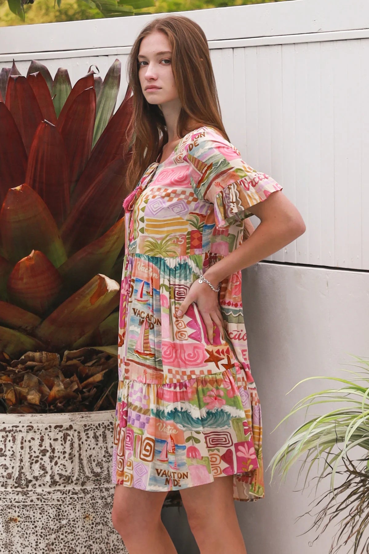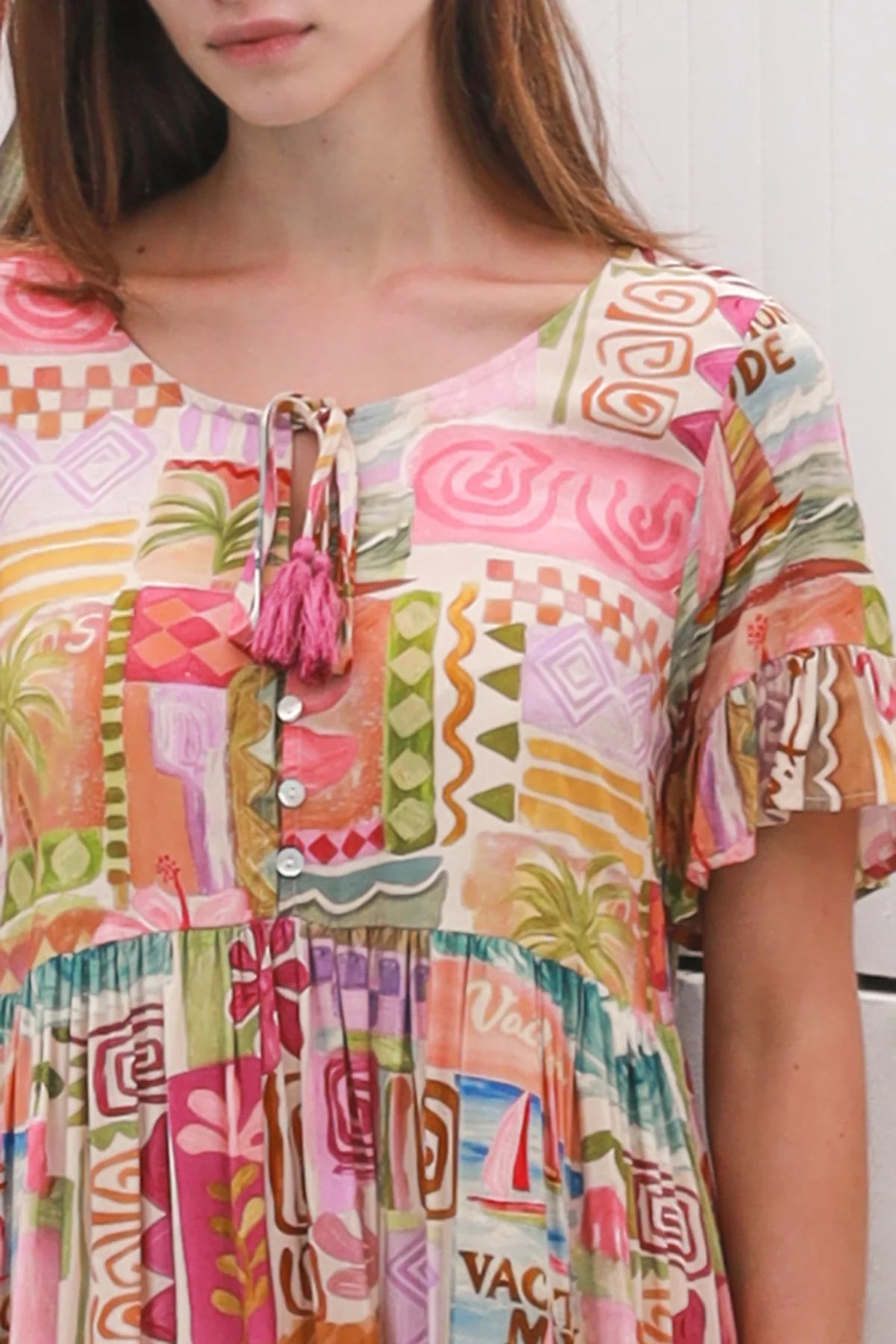 The Sienna Mini Dress is your perfect throw on and go summer mini! She has a gorgeous rose pink toned summery print, V neck with ties and tassels and buttons to the waist. This easy to wear style has short sleeves a mini length tiered skirt and pockets, this dress is a must-have for any wardrobe, so easy to wear!