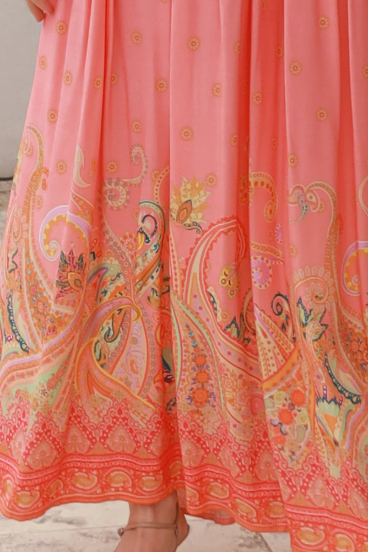 The Sofia Maxi Dress is a stunning vibrant peachy/pink colour with a gorgeous border print! She has 3/4 length kimono style sleeves, and a shirred elastic back waist to cinch it in for the perfect fit. Featuring a v-neck with border print down to the waist and pockets with a full skirt and side splits, this dress is a must-have for your summer wardrobe!