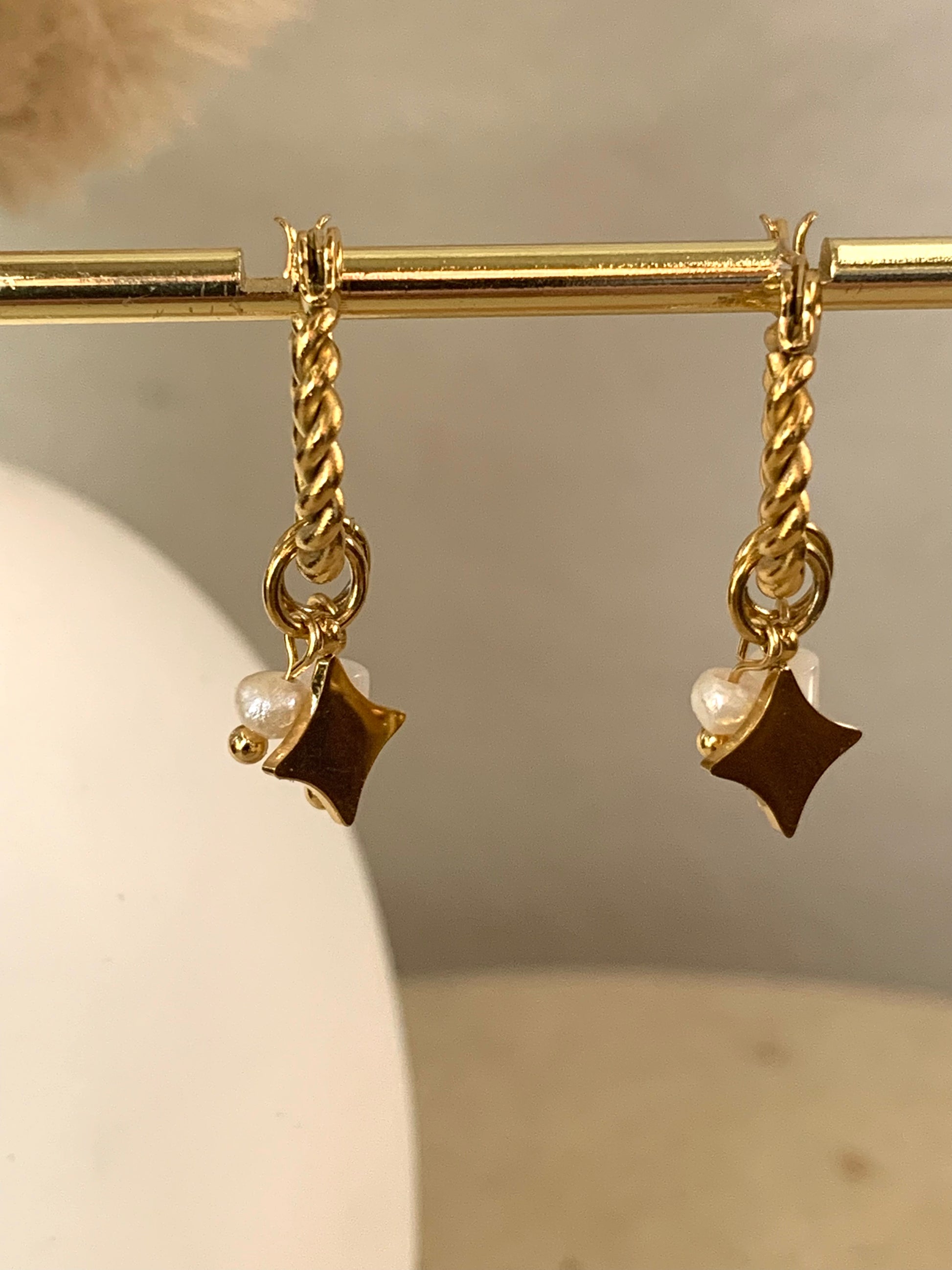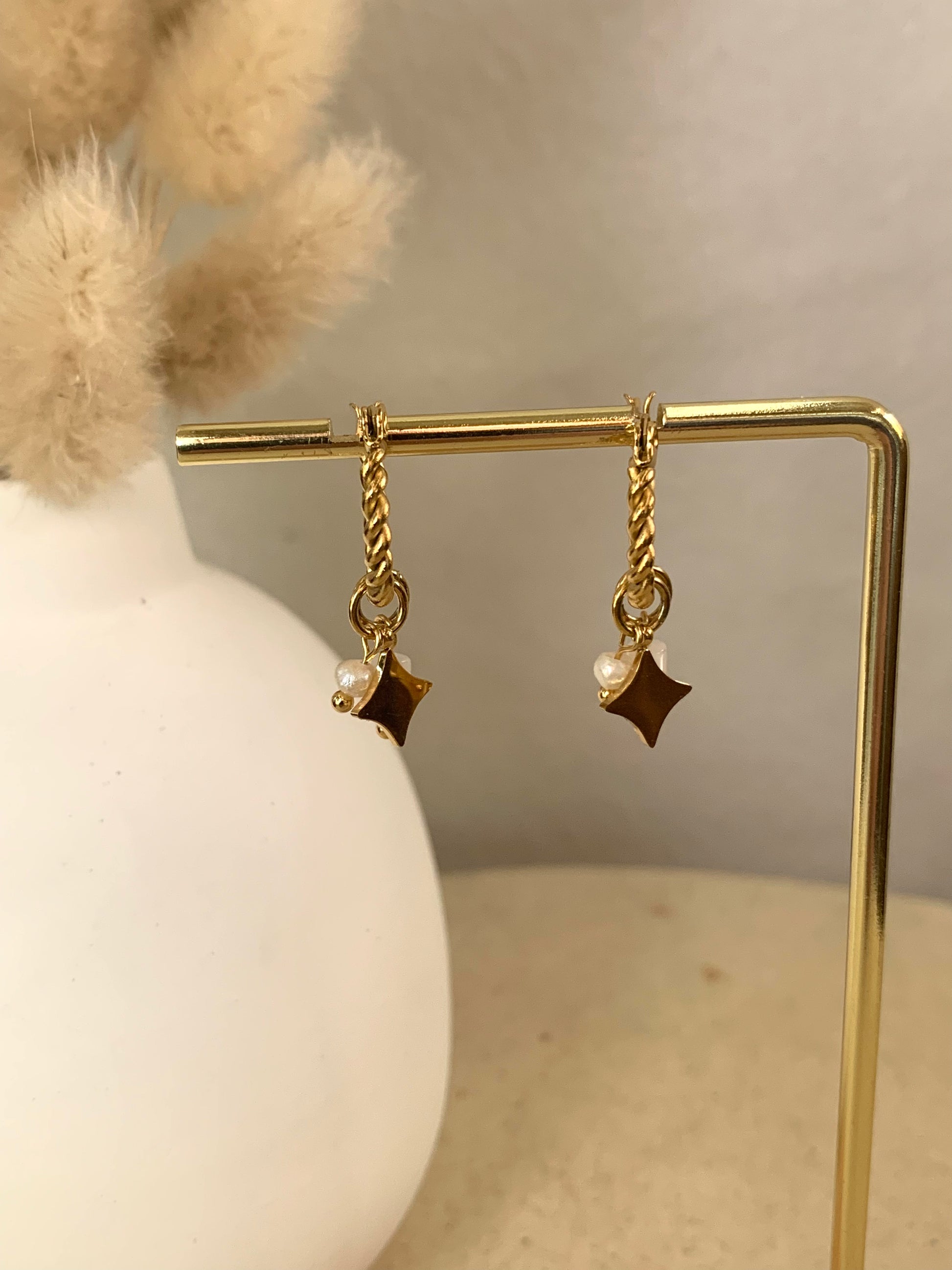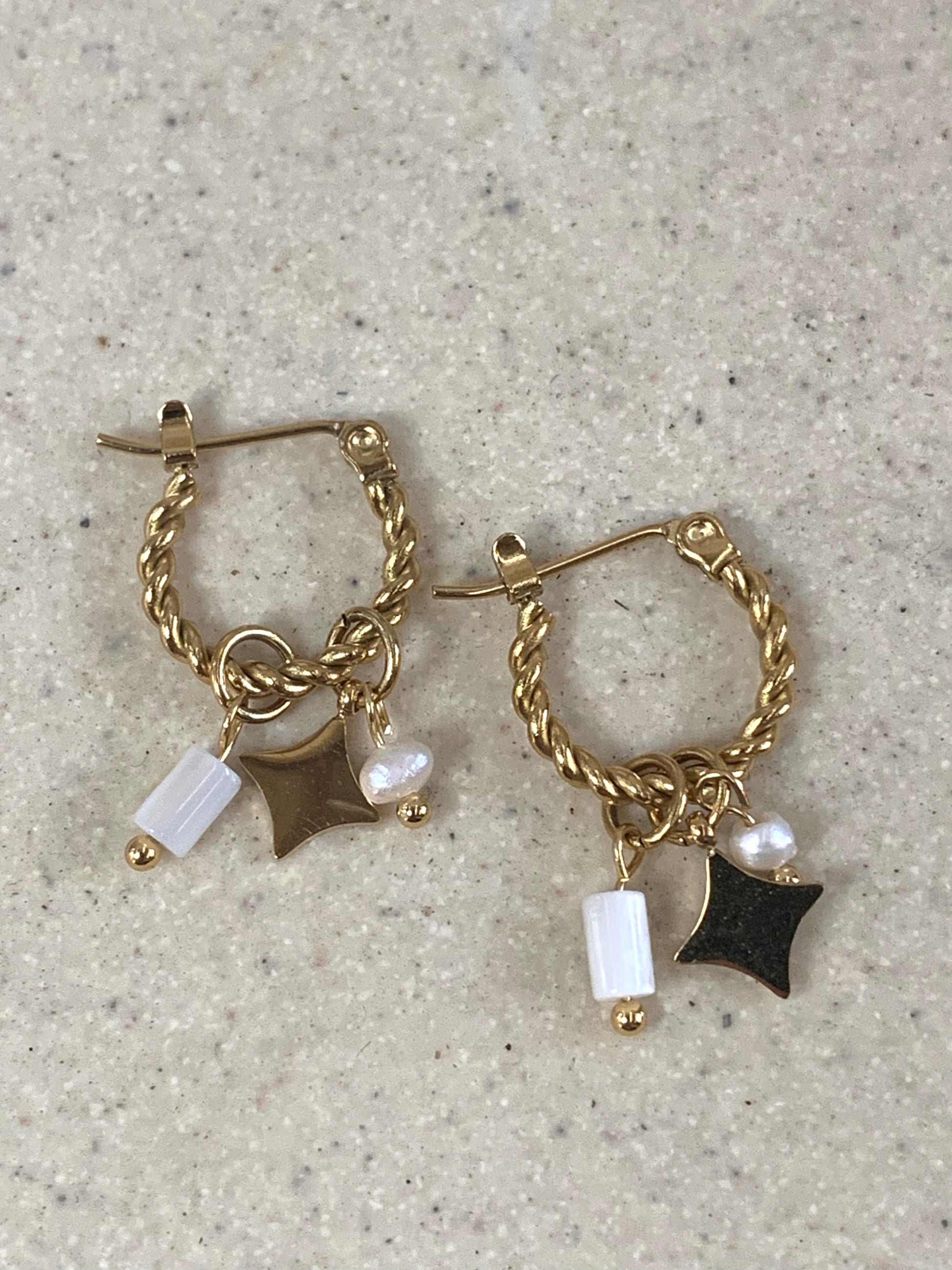 Introducing our Summer Night Hoop earrings, featuring a white stone drops, and a mini star drop on twisted hoops